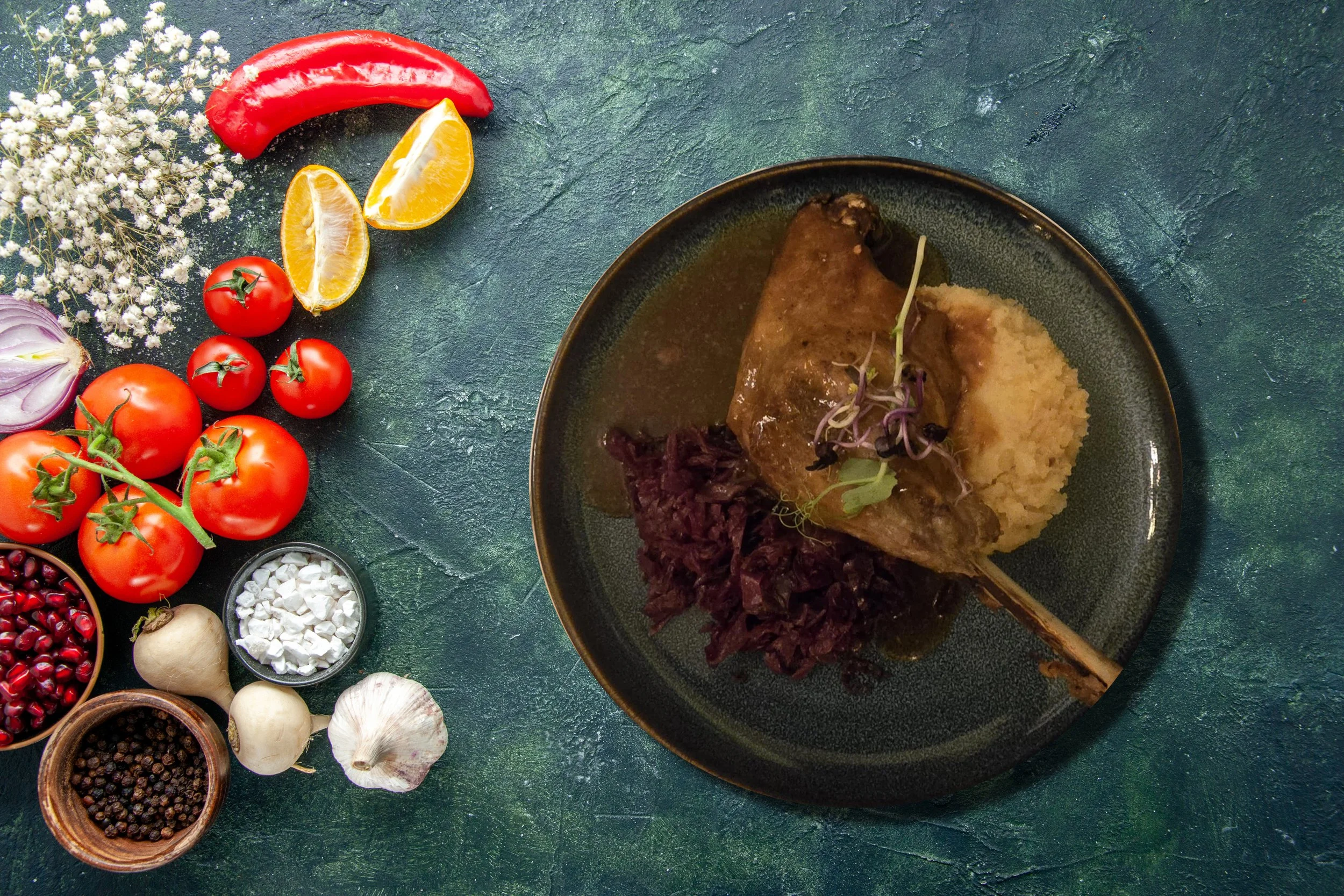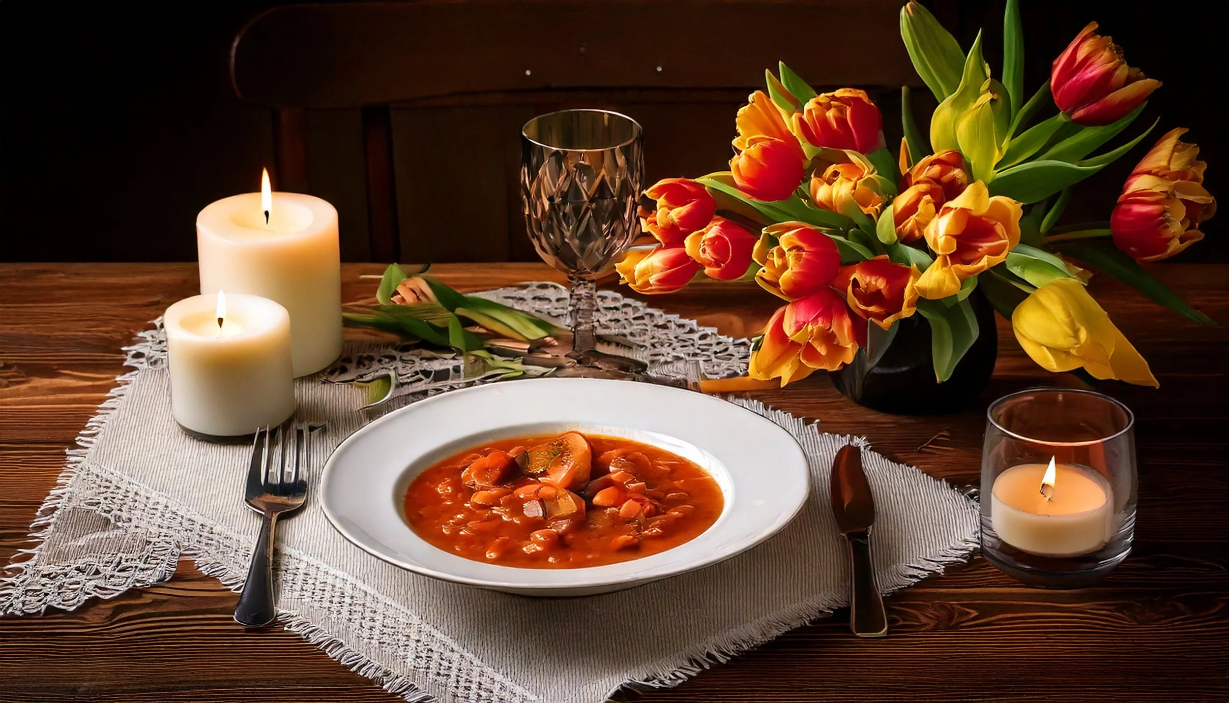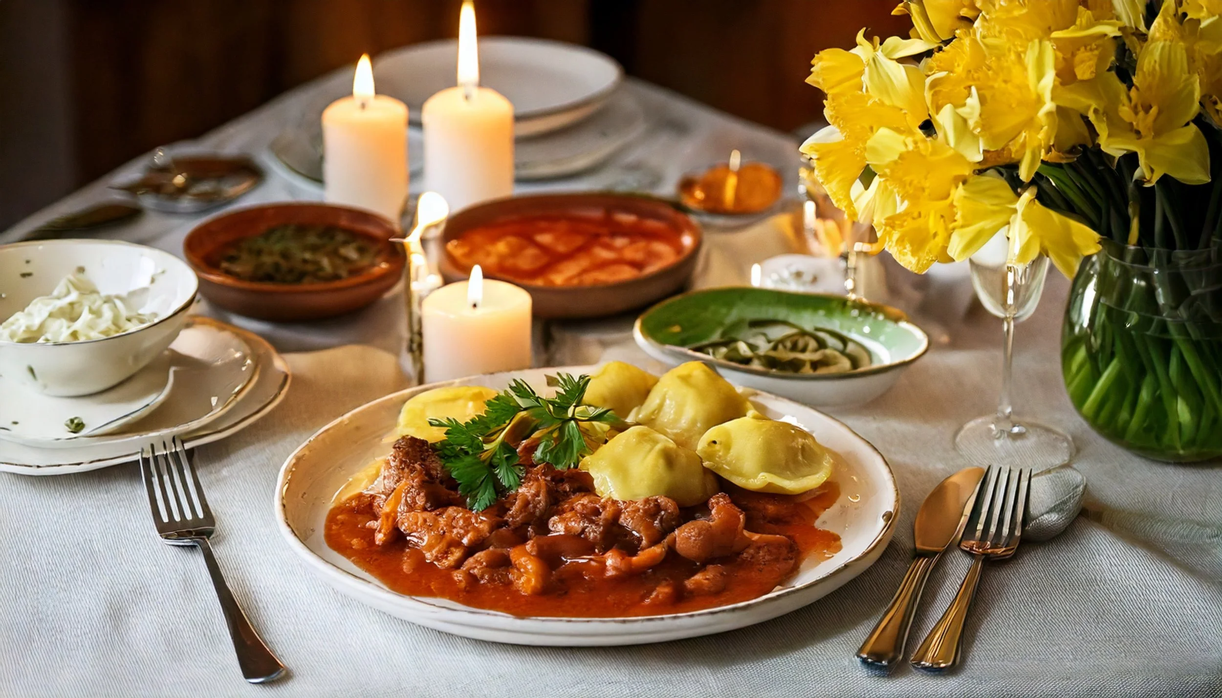 For the appetizer, I repeated the success from my fiancé's birthday, scallops on avocado cream with arugula, spring onions, chevre and walnut salad. Everyone loved the dish this time too! I have to say that I am starting to love making this dish, this is going to be my signature appetizer. If you have leftover avocado cream, it is absolutely fantastic to put on toast for breakfast the next day, with tomatoes. My mother cooked the other half of the dinner. My brother had "ordered" a dish called Vadas, which means game. It is a game stew, with long-cooked pieces of meat, in a pureed vegetable sauce with sour cream in it. Hungarians are very fond of sour cream and dried paprika, but there is no dried paprika in this dish. As a child, I was not very fond of this dish, because there was one instance where my mother had too many carrots in the dish, so everything turned out too sweet. So be careful not to cook too many carrots for this dish, if you want to try making it. This is served with potato balls, this potato ball is not the same as you get here in Norway, I can't say what the difference is, since I don't remember what the difference is. This was served with a red wine called Rolet Arbois Rouge Tradition 1986. This has a strange light brick red color. It doesn't taste particularly good on its own. This wine must be drunk with the food, then it was absolutely fantastic. The reason why many of the pictures were made in AI is because I didn't have the opportunity to take pictures at the table while we ate. I made the appetizer in the kitchen, so that's why I had the opportunity to take one picture right before serving!
