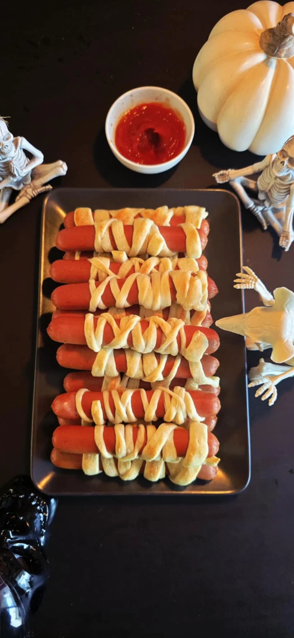 Finally the day I've been waiting for since we went into the fall season came. Namely Halloween, I love this day not because of the party and the fun, but because you can be very creative when it comes to food. I chose to make lunch something we almost never eat. I made little sausage zombies, I did this by wrapping the sausages in pizza dough. You don't have to be exact here, the more holes the butler manages to wrap the sausages in, the better. Then I baked them in the oven at 200 degrees C for about 15 minutes.