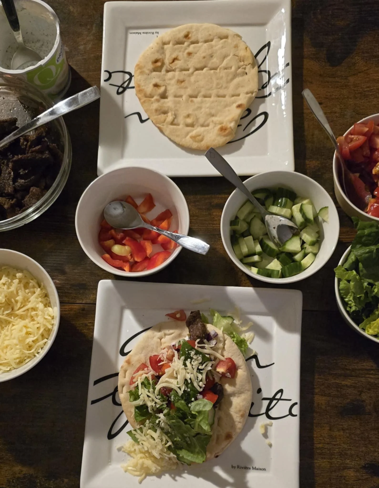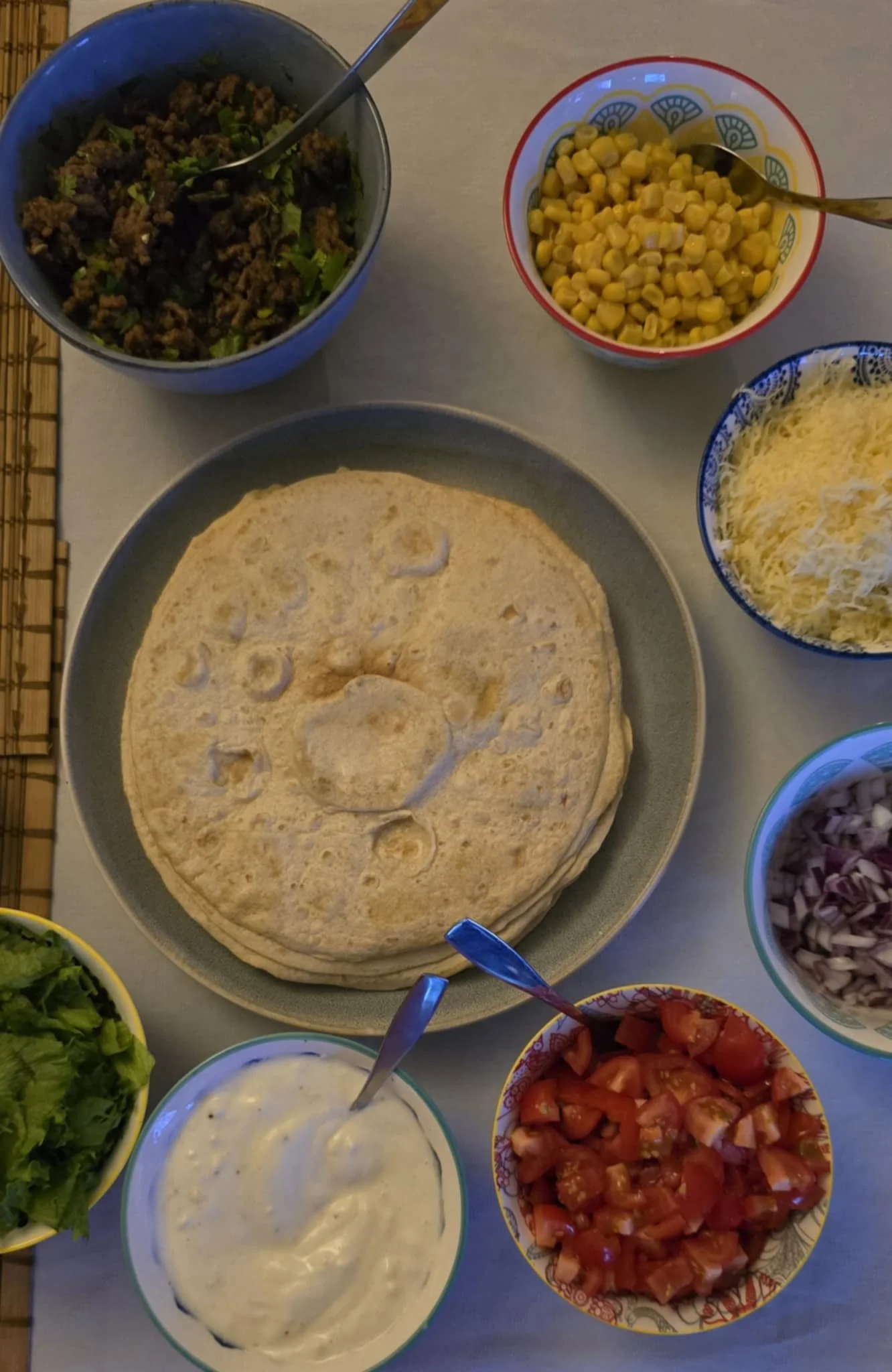 As you are probably aware, this is very similar to tacos. But the flavors are not the same. I seasoned my meat with salt, pepper, garlic powder and chili powder. Fry it quite hard in the pan for 10-15 minutes. Chopped up the vegetables we had in the fridge (there wasn't that much). My sweet partner made a delicious sour cream dressing for the kebab. And Tada, we have a simple and delicious Monday dinner, which can brighten up the start of the week!