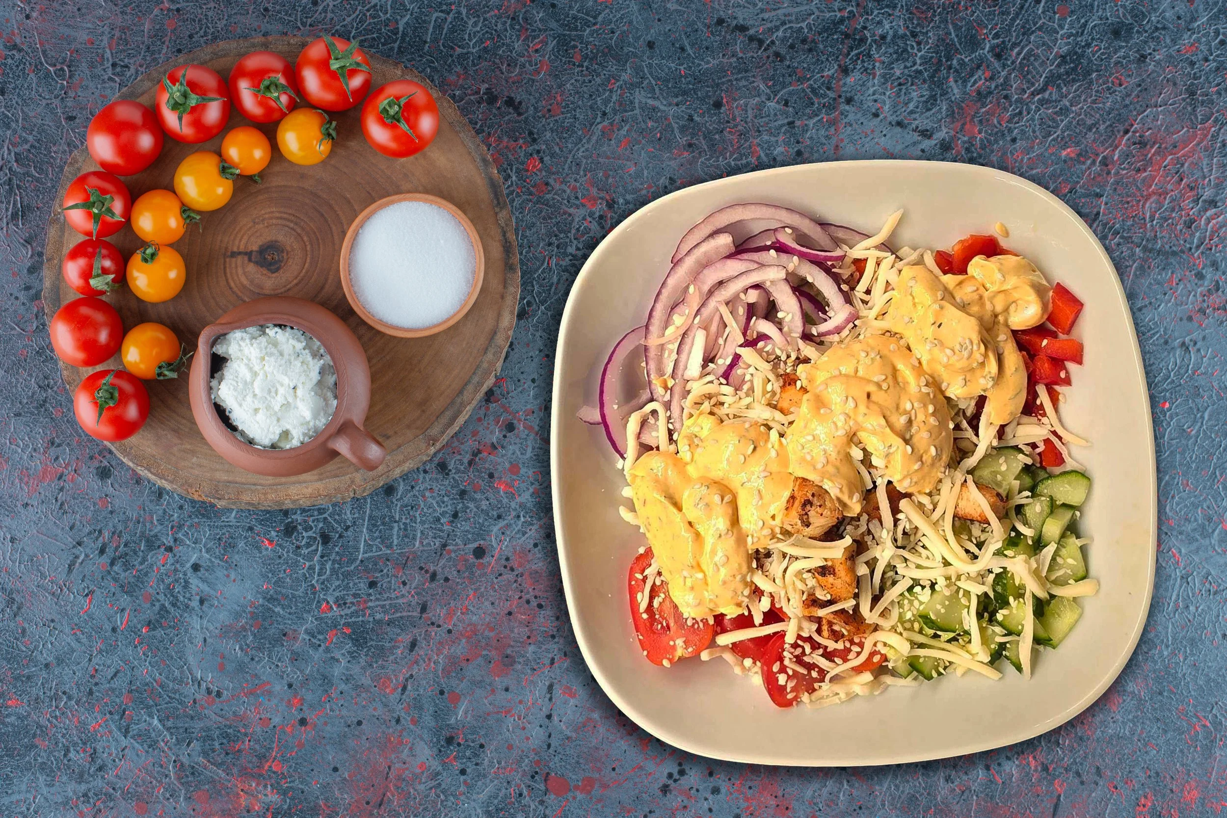 We made a salad for dinner today! A salad that is actually called Burger Bowl, which makes me doubt whether it is really that healthy. But I replaced the minced meat (mostly because I had been itching to buy it) with chicken. Fried 200g of chicken with a little salt and pepper on it, ended up with a little over 100g (where did the rest go)? I put this on the vegetables I had cut up while I was there. Made a little dressing of Greek Yogurt 64kcal per 100g, salt, pepper, garlic and a pinch of chili flakes, and sprinkled some cheese on top. The result was very good, but perhaps a little small considering that this was our only meal today, oh well, lose weight faster then.